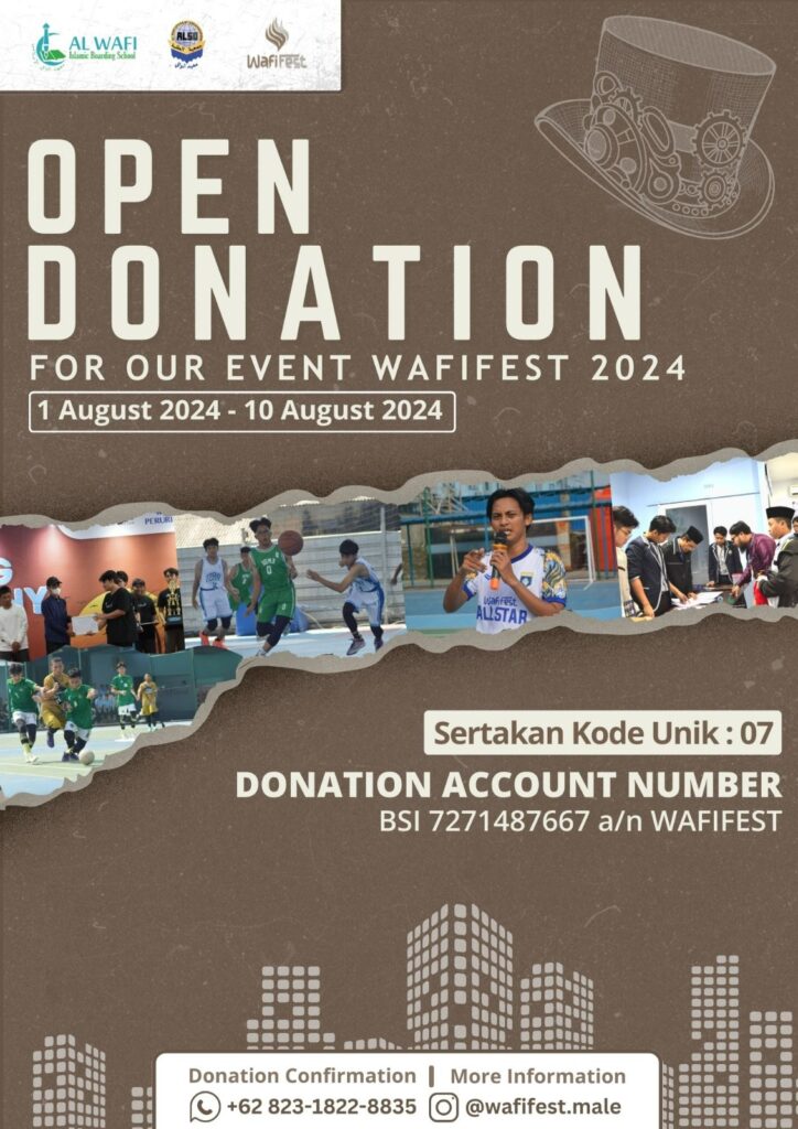 Bogor, 18 Juli 2024 – Pondok Pesantren Al Wafi Islamic Boarding School kembali mengadakan festival perlombaan WAFIFEST edisi ke-3 pada tahun 2024. Al Wafi Festival (WAFIFEST) merupakan festival tahunan Al Wafi Islamic Boarding School yang dimulai sejak tahun 2022. Berbagai perlombaan akan hadir, baik online dengan skala nasional maupun offline dengan skala JABODETABEK. Selain itu, WAFIFEST juga akan dimeriahkan dengan berbagai bazaar, mulai dari makanan hingga fashion.
